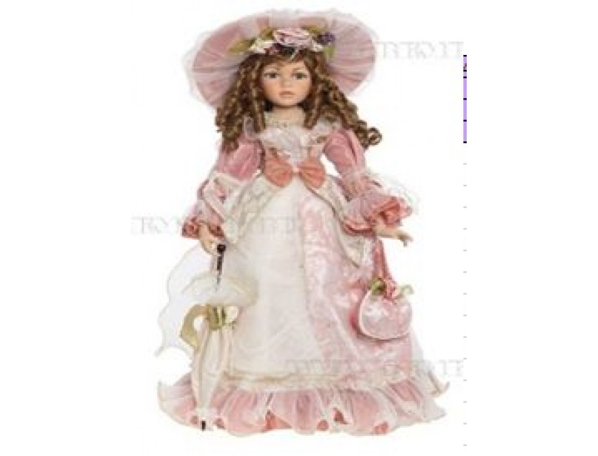 У куклы очень доброе лицо и выразительные глаза, пушистые ресницы и красивые каштановые волосы. Ее роскошный нежно-розовый наряд с оборочками и кружевами дополнен аксессуарами — чудной шляпкой, сумочкой и зонтом в цвет платья, которые точно не оставят никого равнодушным. Все детали коллекционной куклы продуманы до мелочей. Ее тело пропорционально и гармонично, выполнено из тончайшего фарфора молочного цвета. Такая кукла обязательно займет почетное место на полке и станет источником Вашего вдохновения.