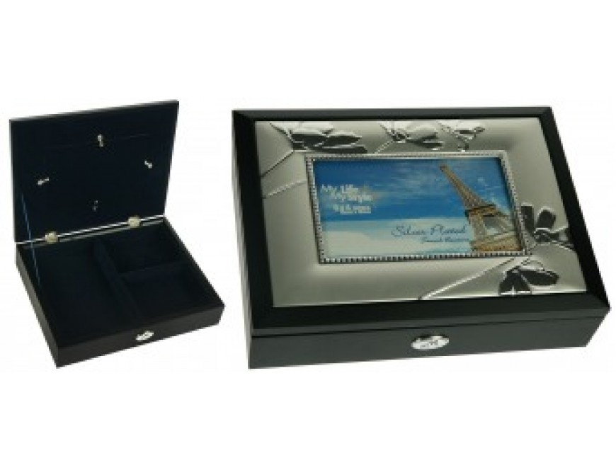 Обратная сторона крышки имеет шесть хромированных поворотных скоб, которые удерживают подложку фоторамки. В целом этот оригинальный подарок женщине смотрится на порядок дороже своей цены. Строгий черный корпус шкатулки притягивает матовым блеском полировки, а хромированный шильд на торце говорит о принадлежности к дизайнерскому дому Moretto.