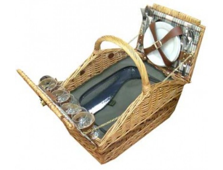 Этот набор для пикника выполненный в «сельском» стиле из лозы ивового дерева и окрашенный в приятный цвет листвы. Набор для пикника - это ручная работа, а, значит, сделана на совесть и с любовью. Помимо всего прочего, плетеные изделия – натуральны, они «дышат», продукты в них не приобретают неприятного запаха и не плесневеют продолжительное время. Набор для пикника рассчитан на четырех человек и включает в себя самые необходимые предметы и приборы. Ничего лишнего. Ничего такого, что бы было в наборе, но использовалось очень мало или не использовалось вовсе. 4 тарелки и 4 стакана, 4 набора столовых приборов, солонка, перечница и штопор. Вот, пожалуй, и все. Вы спросите: а где термос? Где контейнеры для еды? В данном случае производитель набора для пикника пошел другим путем: он не стал укомплектовывать набор стандартным и наиболее полным перечнем предметов, а наоборот – освободил пространство и предоставил хозяевам этого набора самим решить, что будет находиться внутри этого объемного саквояжа-сундучка. Как видите – ему это удалось. Места много, и экспериментировать с его составом можно легко и каждый раз по-новому, в зависимости от того, на какой пикник вы собрались. Недалеко и ненадолго, значит термос не нужен. На целый день и с долгой поездкой до места назначения, значит в саквояже будут лежат и свертки с перекусами, и контейнеры с едой, и бутылочки с напитками.